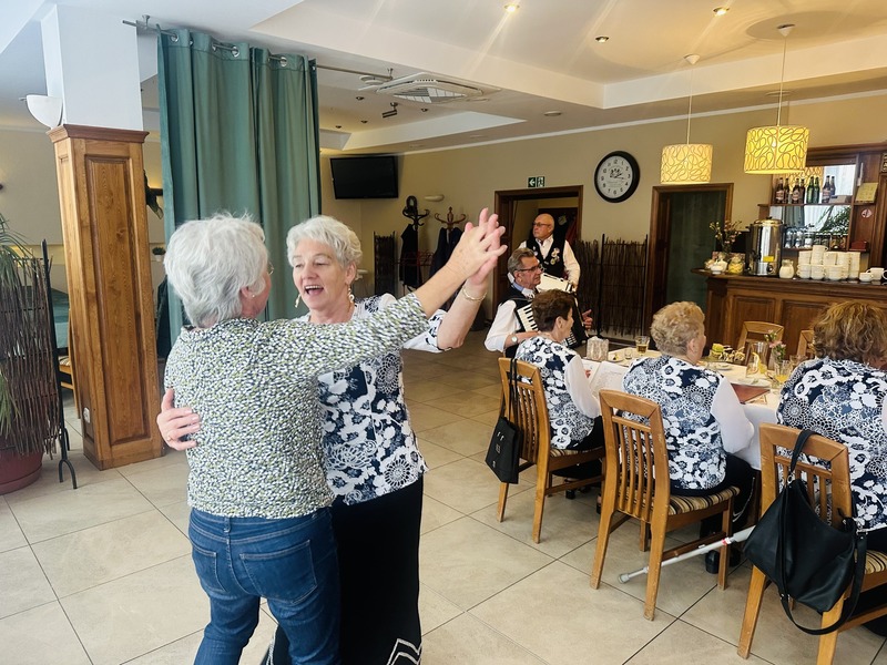 Zwieńczeniem wizyty było spotkanie w restauracji „Morska” , gdzie do niemieckich gości dołączyły członkinie zespołu ludowego „Sławianie” . Nie zabrakło wspólnego śpiewania, tańców i rozmów .